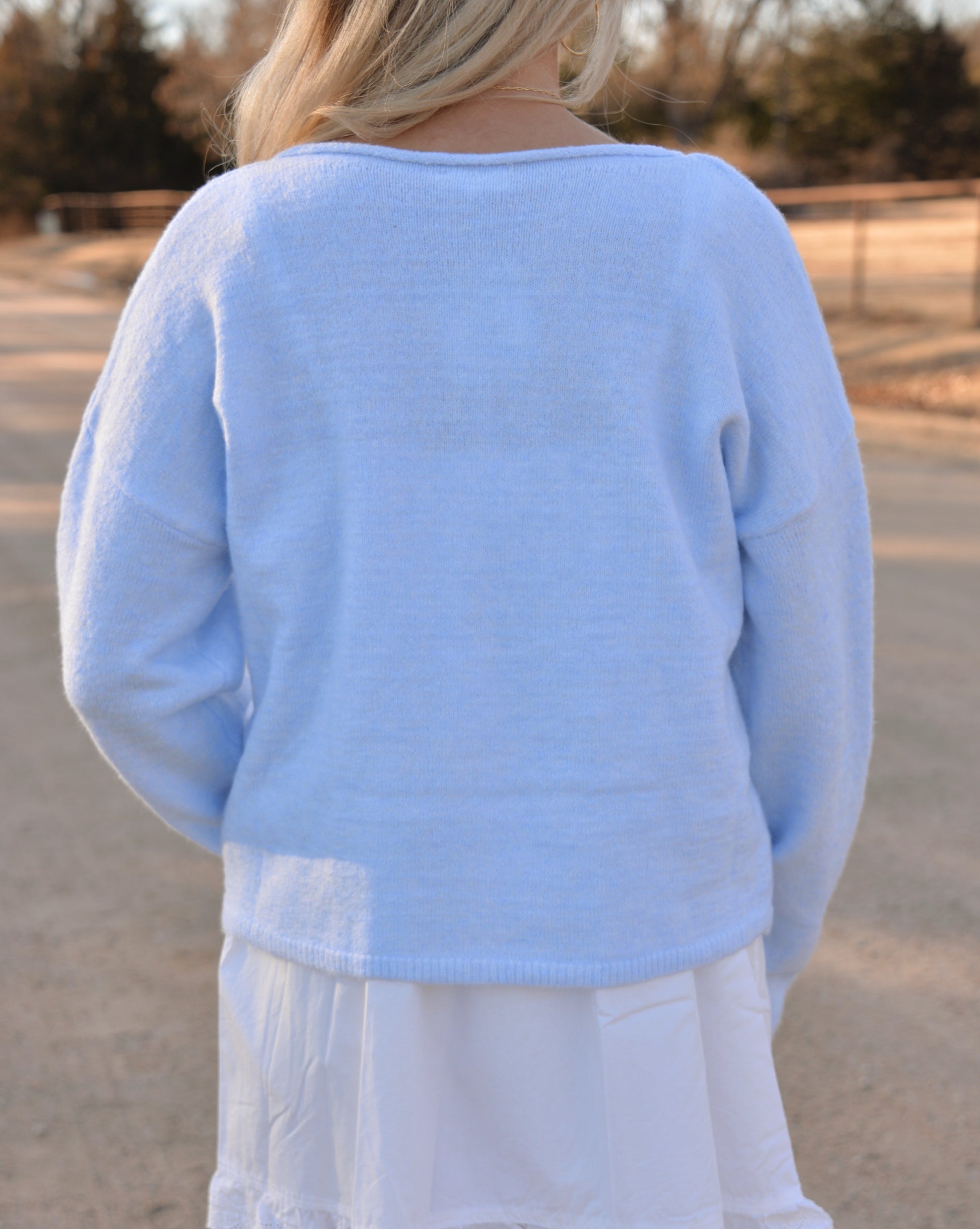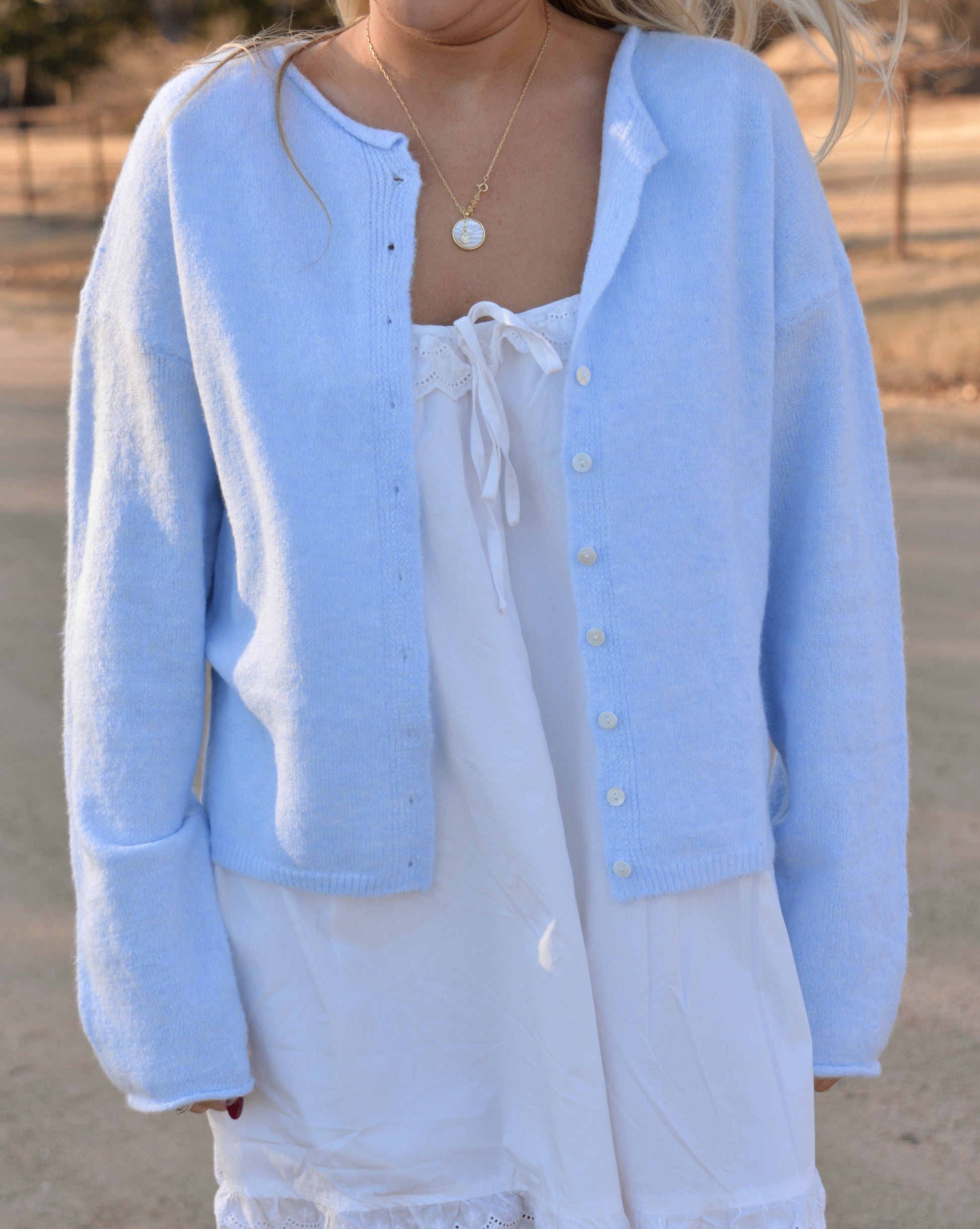 Soft, lightweight cardigan. Classic button-front design with a relaxed fit. Paired with the Sunday Morning Mini-Dress. 61% Polyester 15% Acrylic 15% Nylon 6% Wool 3% Spandex.