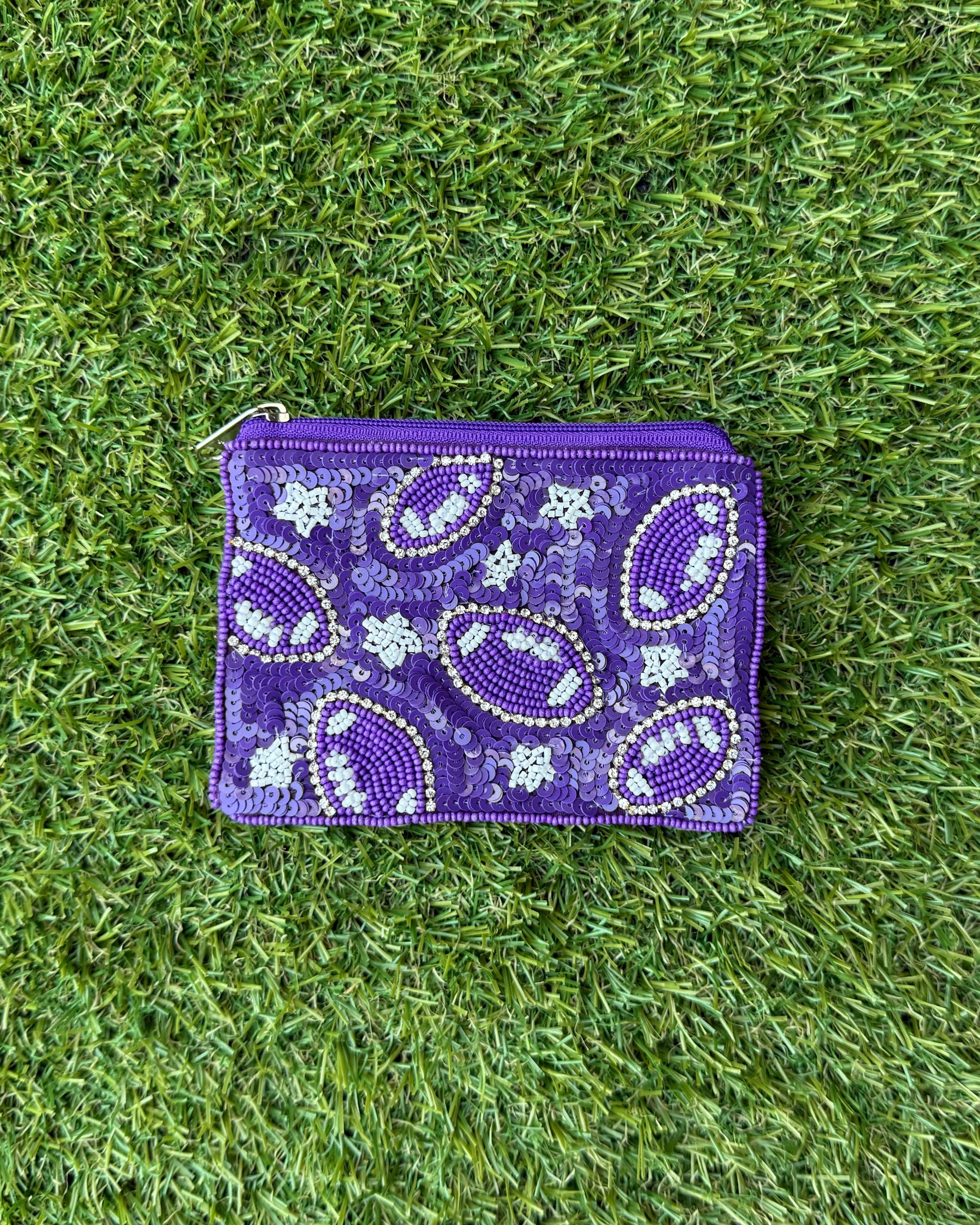 Purple sequin coin purse with all-over football and star beading. Compact and chic—fits cards, cash, or gloss for game day essentials. Zip-top closure for secure storage. Perfect for tucking inside a clear stadium bag or gifting to your game day girls.