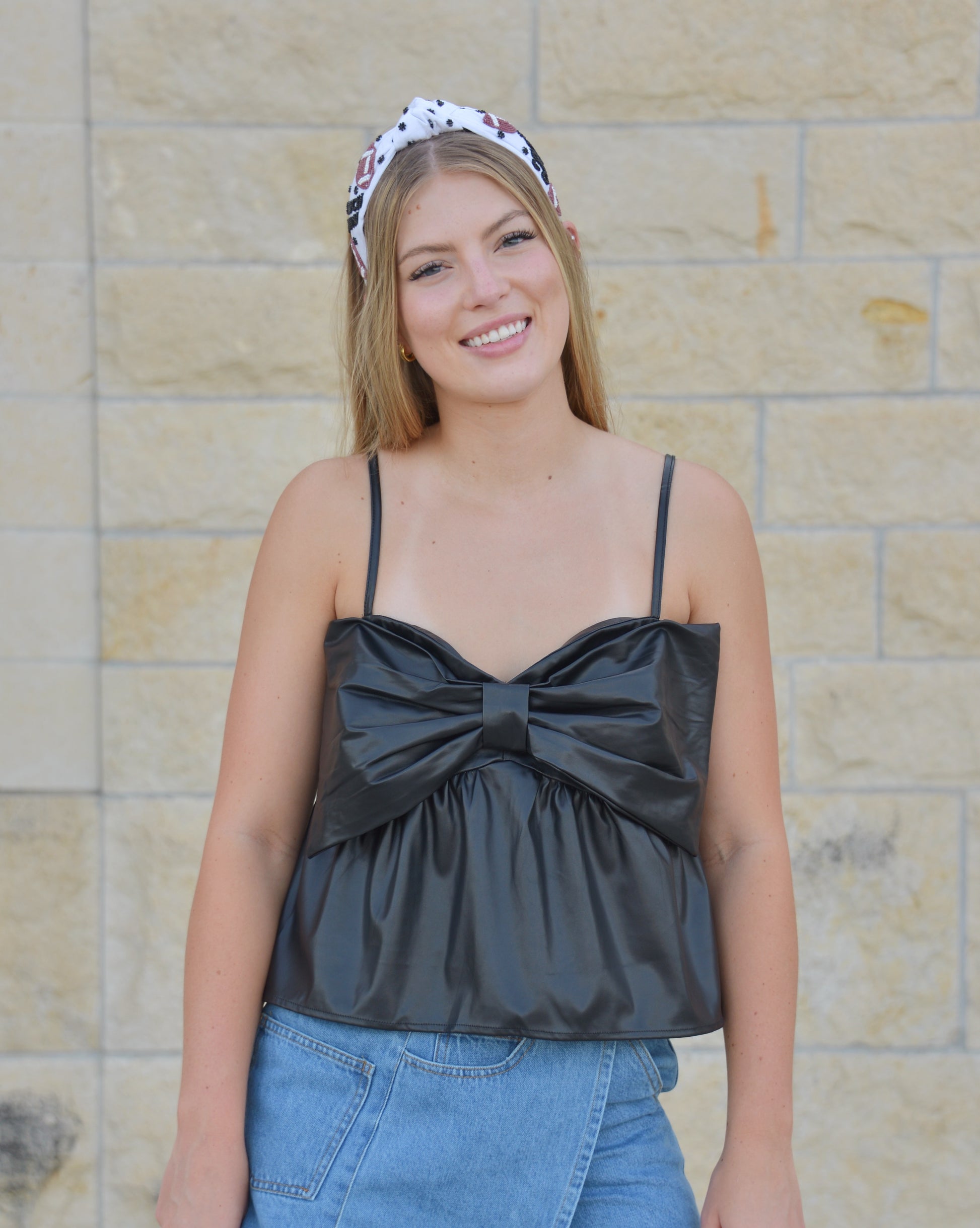 Faux leather fabric with a glossy finish. Statement oversized bow detail on front. Adjustable spaghetti straps for a custom fit. Cropped. Back zipper closure. True to size with minimal stretch.