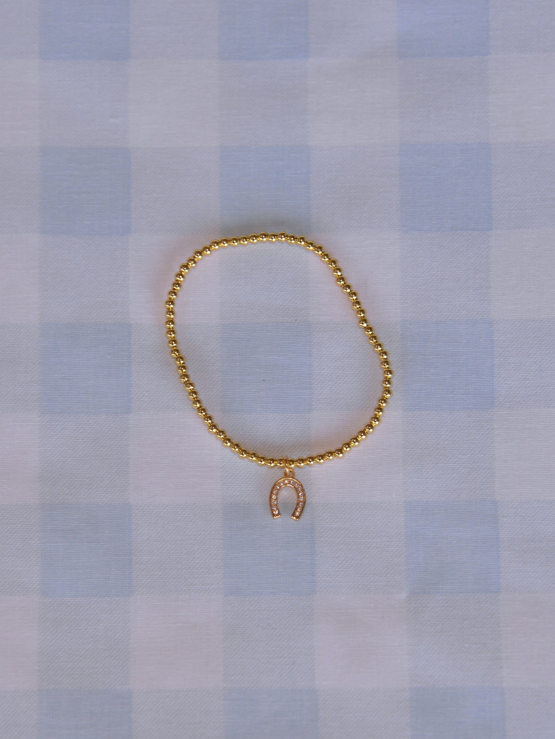 This gold horseshoe bracelet brings a soft feminine style and a gentle western touch to every outfit. The horseshoe charm has rhinestone details.