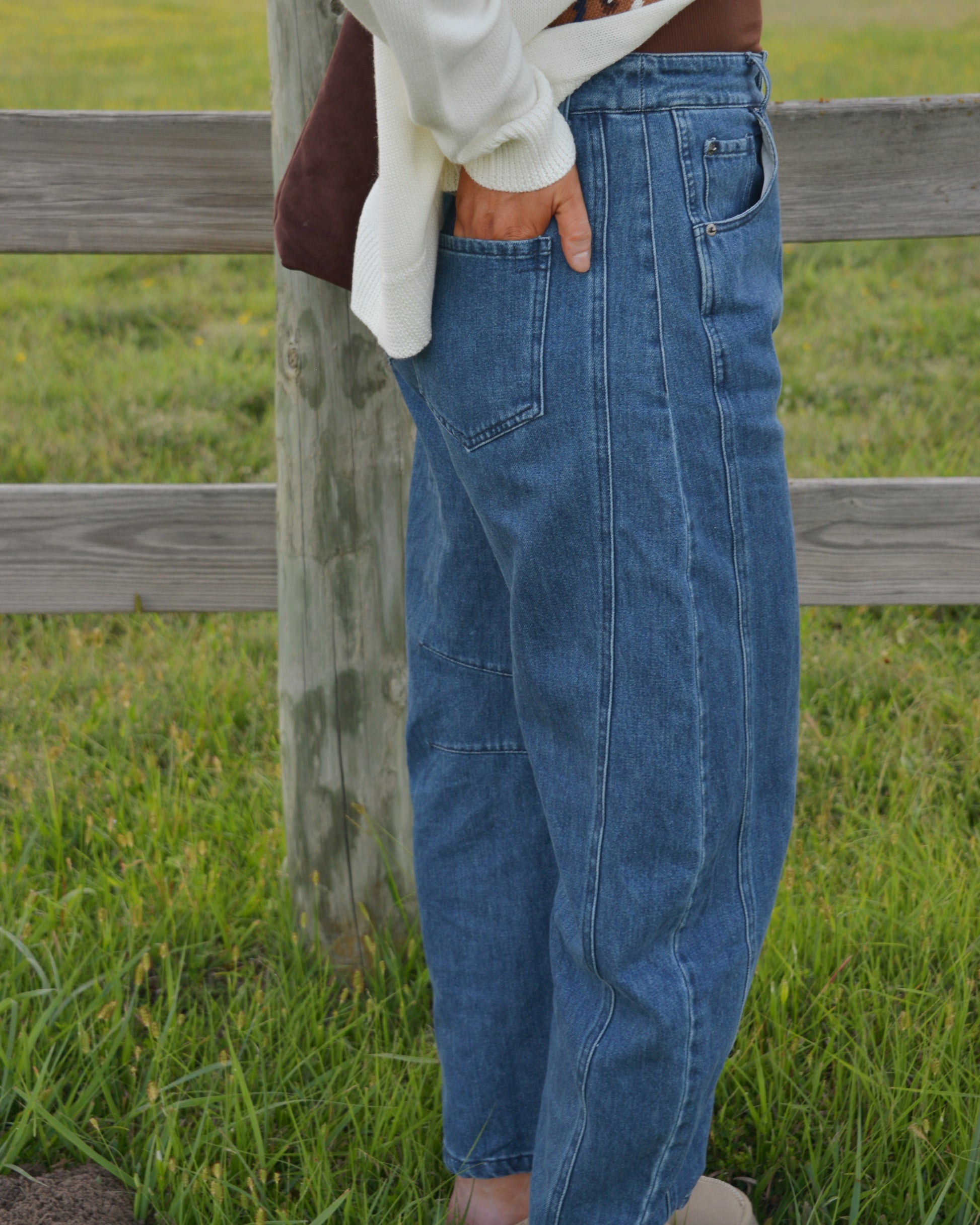 Relaxed barrel-leg silhouette. Dark-wash denim with soft structure, easy to dress up or down. High-waisted fit with seam details that flatter the leg. Functional back and side pockets. Cropped ankle length — perfect with boots, clogs, or cozy slip-ons. Paired with our Saddle Up Sweater.