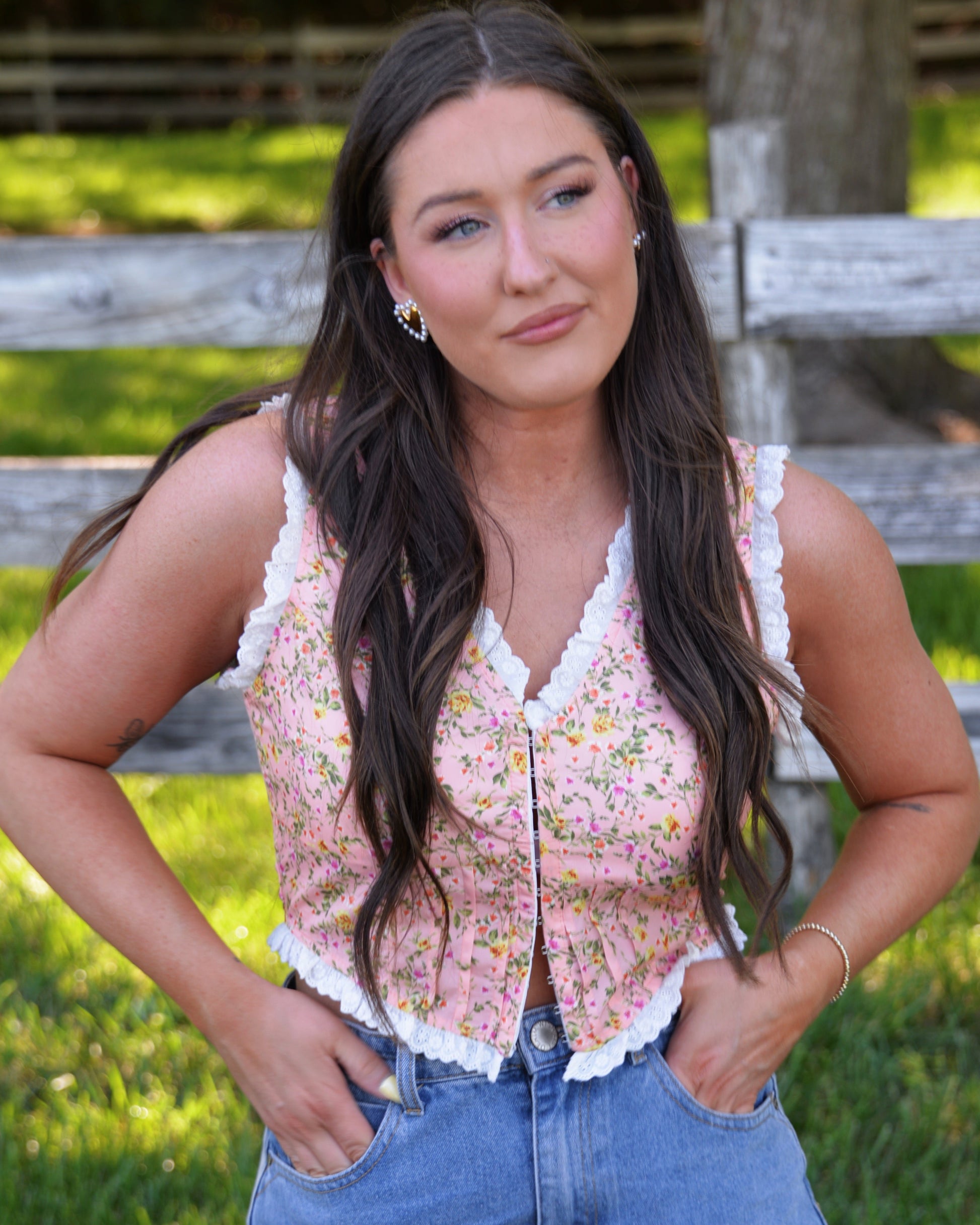 Peach floral print with soft yellow, pink, + green accents. Scalloped white lace trim on neckline and hem. V-neckline with front hook-and-eye closure. Slightly cropped, fitted silhouette. Lightly structured with seaming detail. True to size – size up if between.