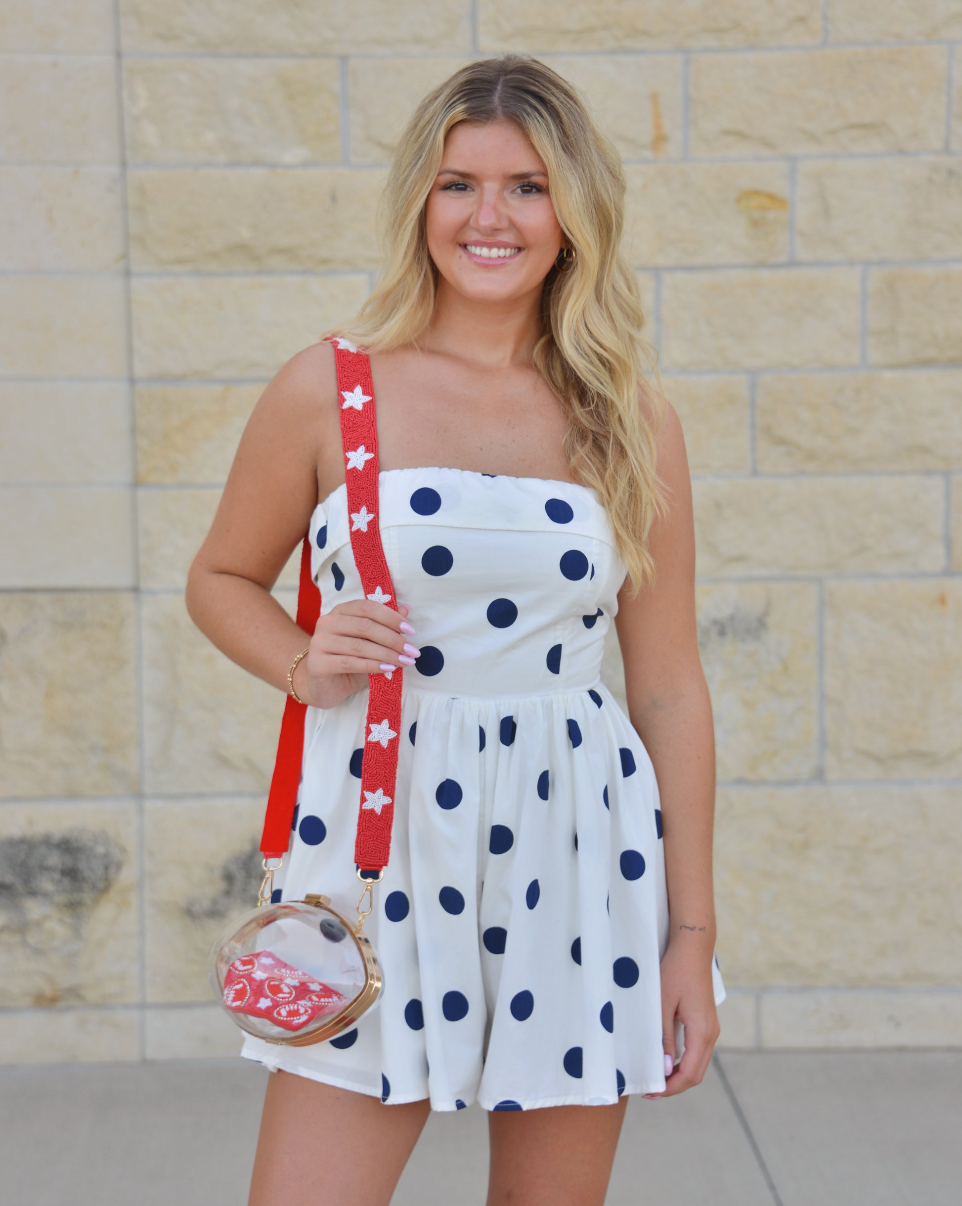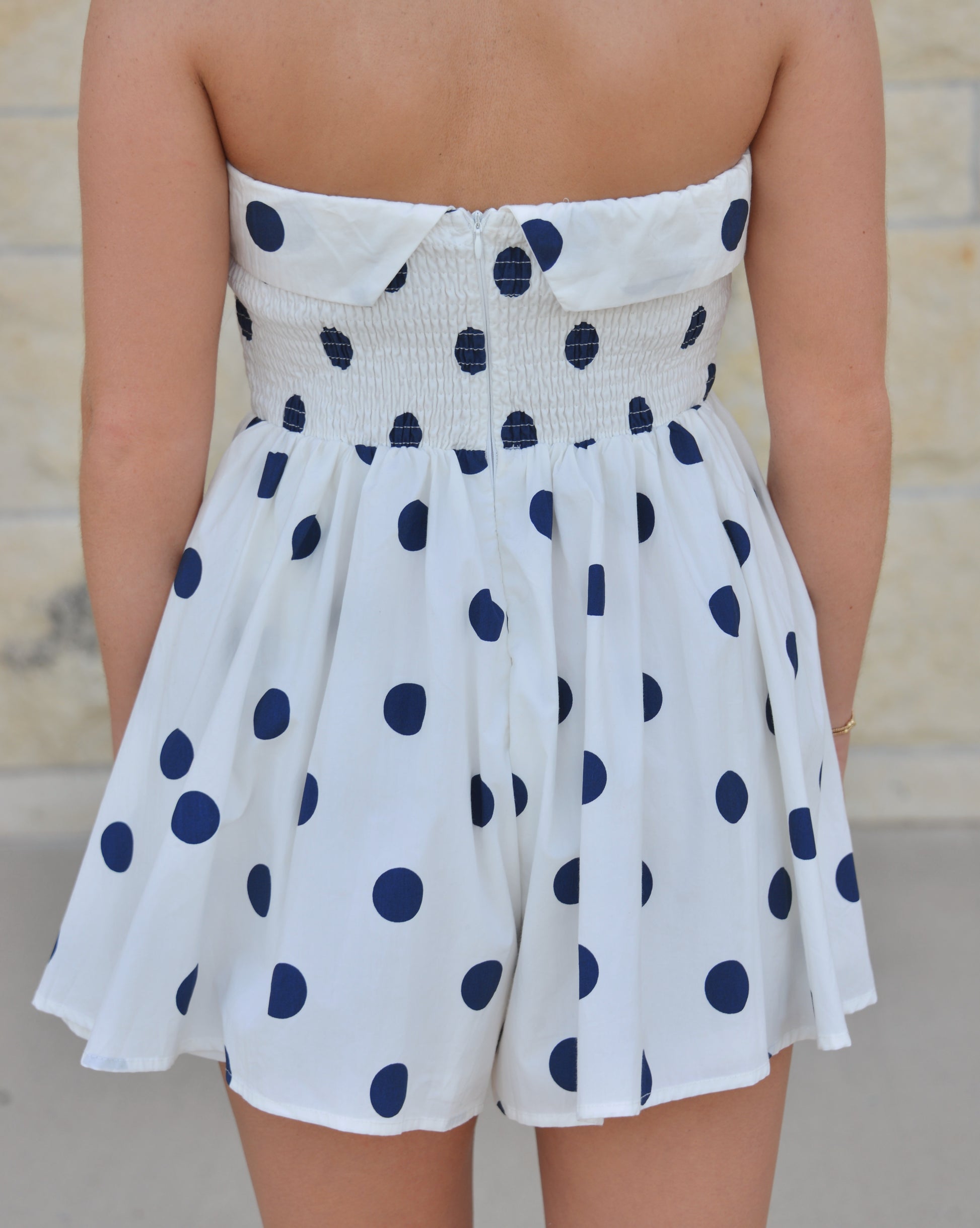 Strapless white romper with bold navy polka dots. Back zipper closure for a smooth fit. Flowy, skirt-like shorts. Fully lined for comfort and coverage.