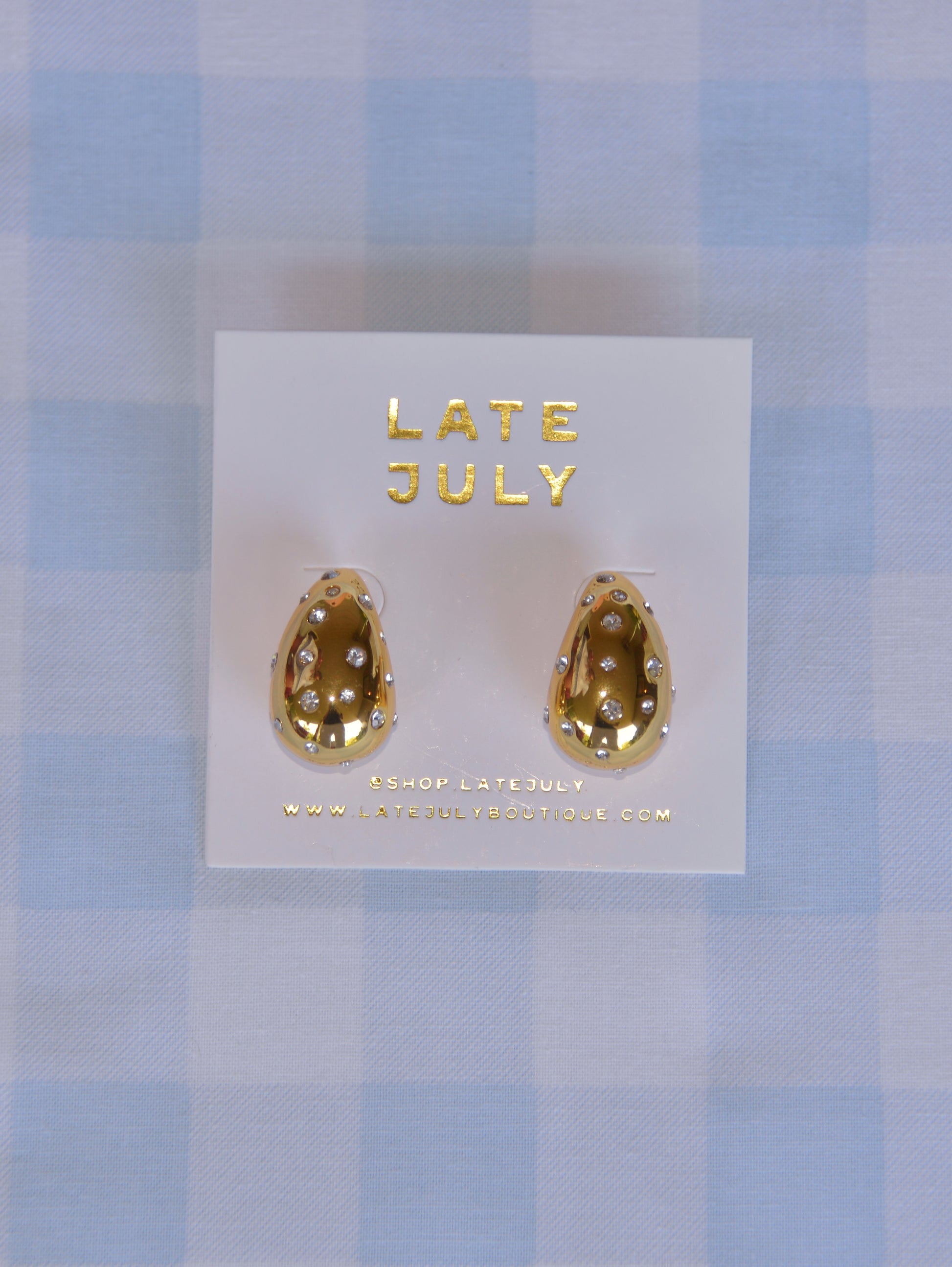 Gold-toned teardrop earrings scattered with tiny crystals that catch the light. Lightweight yet eye-catching, they add just the right amount of shine to your rodeo-ready look or evening out. Perfect for pairing with denim, lace, or anything that needs a little extra sparkle. Waterproof & Hypoallergenic.