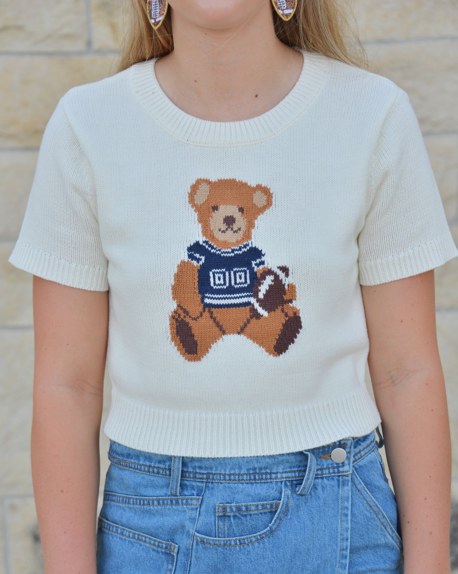 Cream knit short-sleeve sweater featuring a teddy bear in game day gear. Soft and cozy with a stretch for comfort and layering Cropped silhouette. Ribbed hem, sleeves, and neckline for a structured fit.